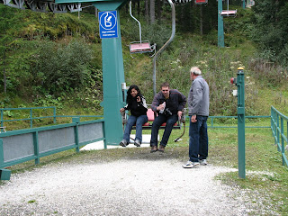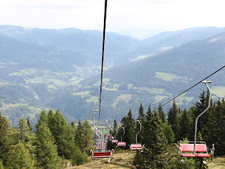 The journey back down the mountain was nothing short of spectacular. The view was astounding, crisp and clear and beautiful. We could see for miles up and down mountains and valleys, lakes near and far, villages dotted far as we could see, and some closer ones with their church steeples standing out stark and white against an amazing green backdrop. We reached the bottom of ski lift three (gracefully again, of course) and agreed our exceedingly well spent time.