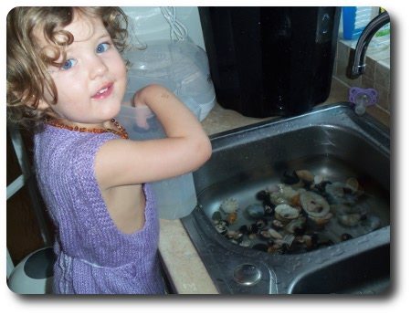 One of the principles of one of the homeschool systems – is it Montessori? – is that children should have a pet. We don’t have a pet, but we do have a fish tank, and while we have one very much because I want one, it’s Ameli’s fish tank and Ameli’s fish and her responsibility to feed them every day – although I have to prompt her every day – but then, she is two. We follow a beta fish care guide. So every day she feeds ‘her’ fish and from time to time, we have to clean the tank: far more frequently than I ever remember cleaning our family tank when I was growing up!  But cleaning doesn’t have to be all hard work – here she is ‘cleaning’ the shells. She spent absolutely ages playing with the shells. It was actually quite fun doing it together.