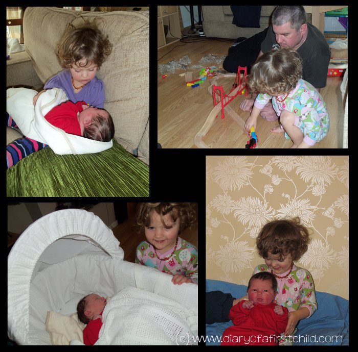 I’m floored by how good Ameli’s been at accepting her sister into her life. It’s been amazing. She’s so helpful and so incredibly kind to the baby, it’s awesome.  Here we have Ameli sitting with the baby, Ameli and Daddy playing with the trainset the baby ‘brought with’  and two more pics of big sister doting on little sister.