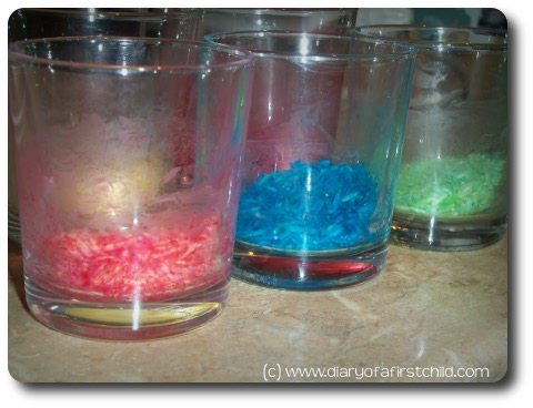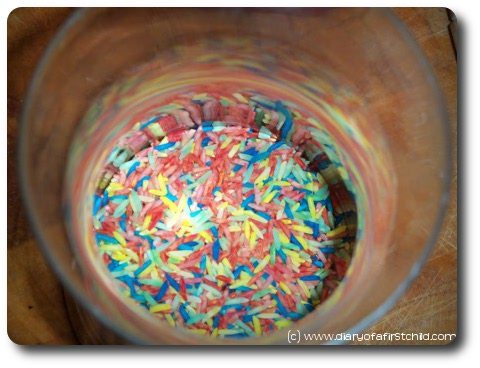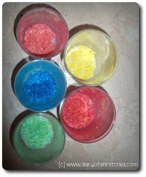 Fun! I never really thought of coloring rice. What my little one and I have are just the white ones mixed with corn kernels. He has to separate them to develop his fine motor skills as I learned from Montessori. Now, separate colored rice is more challenging. Thanks for this!