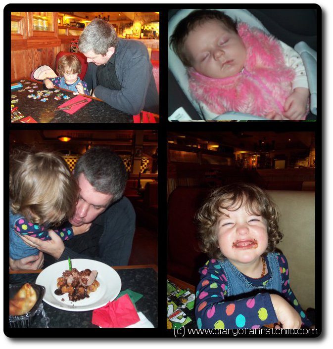 It was Martin’s birthday and I was really happy that we’d been given a voucher for Frankie & Bennys Restaurant a few weeks earlier, and it had arrived in the post that day! We packed ourselves and the girls off to the restaurant in Guildford for our first dinner out as a family of four. Aviya was fine – she slept through most of the dinner, and when she wasn’t sleeping she had a relaxed feed. Ameli is a little harder to entertain in these circumstances – she won’t even sit in her chair at home – but on our arrival the waiter gave her a puzzle book and set. The book was too ‘old’ for her, but the puzzle was a hit!