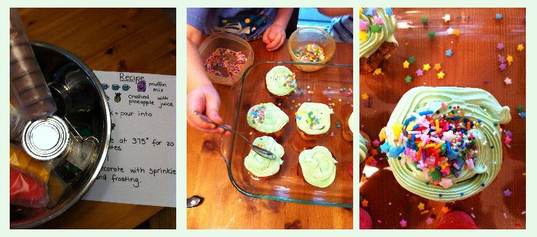 Since I had them all psyched up, we decided to do some baking. I prepared an easy to read recipe with pictures, seeing as my oldest is just starting to read. We made carrot and pineapple muffins and iced them with green cream cheese frosting.