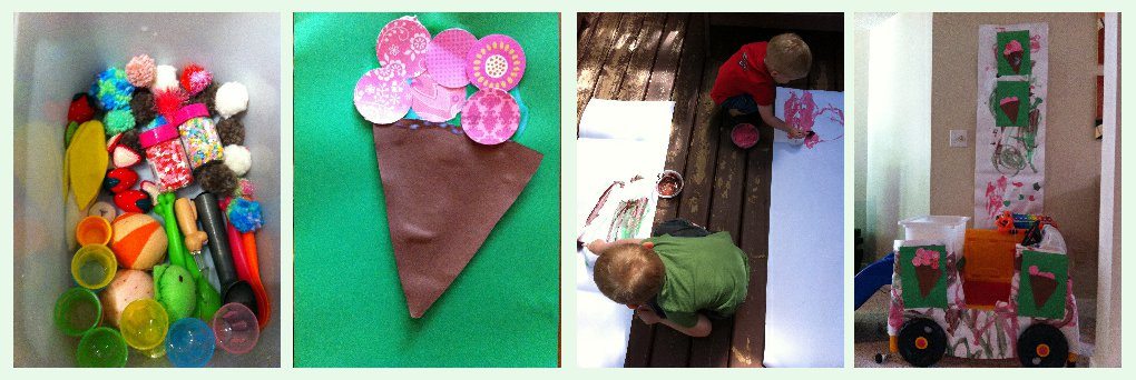 We have a climber and slide that looks like a school bus, somehow the boys decided that it should partner with the sensory box and become an ice cream truck. That got me thinking and on Tuesday morning we painted butcher paper panels to decorate our truck.