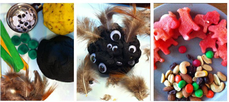 Tuesday we tried our hand at the binoculars. I think I slightly overestimated my children here. If anyone tries this at home, I would suggest finger paint or tissue paper for covering the loo rolls. Our regular paper, wouldn’t stick and it turned into a decoupage activity. No fun with preschoolers! I also made a few fresh batches of playdough. I added course lemon lavender sea salt to the yellow batch to make sure it was a little more tactile. I provided feathers, googley eyes and other bits and pieces. My little guy decided to make an “animal” I thinks it looks pretty scary, if I met this creature in the middle of the night, all bets would be off!