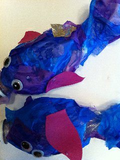 Friday we read some more stories, and we made some lovely “Rainbow fish” from empty water bottles! The tissue paper worked much better than regular paper to cover the bottles, the boys also loved to glue the one “special” scale to their fish