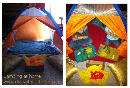 - Tuesday: Tent ( Fold a triangle in half, open, cut half way up the middle line, and fold flaps back) and full moon picture (would be nice with glow in the dark paint).
