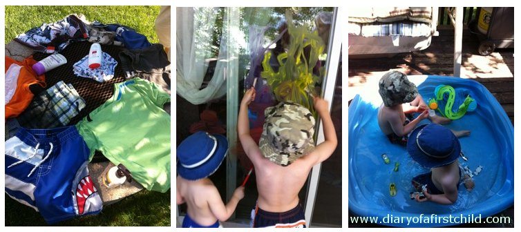 We are experiencing a heatwave this week( Disclaimer: my children are wearing clothes in these pictures! I promise!) , I’m talking temperatures well into the 30’s. So on Monday (with a high of 39) we spent a lot of time playing outside in the water, crafts were put on the back burner this week! You know its crazy hot when you have this many pieces of clothing drying on the firepit!