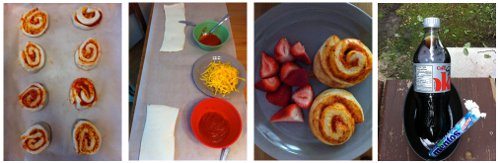 Shopping list: Bananas, ingredients to decorate, balloons, soap boxes, pizza dough in a tube, cheese, pepperoni, pasta sauce, diet coke, menthos, paper plates, construction paper, paint, glue, toilet paper rolls.