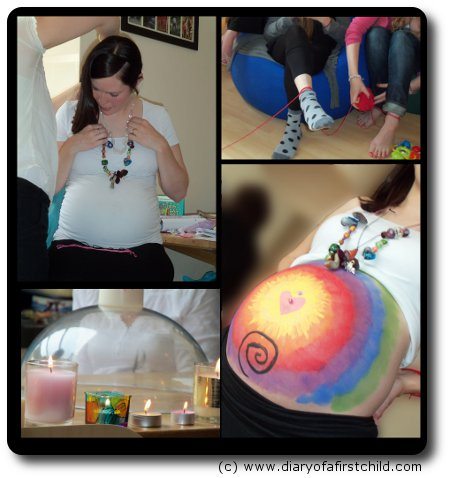 The ‘Natural Parenting’ alternative to the babyshower is the blessing way, a meeting together of women to pour out blessings on the mama-to-be and her baby.  Rhiannon was my doula with Aviya’s birth and it was so special being at her Blessingway. We each brought a bead which we gave with a blessing. We joined the mamas together with a red thread, which we were to wear on our ankles or wrists till the baby is born. We each gave her a candle to light while she’s in labour, and then we ate cake while Laura, who hosted the Blessingway did beautiful belly art.  It was a rich, powerful and beautiful experience.