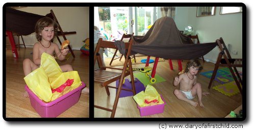Oh, I have looked forward to doing this with  my own children! And Ameli just loved it! The week after Ocean is Camping and since we had an afternoon ‘off’, we decided to go on with the Summer Camp theme. I made ‘hot dogs’ out of shortcrust pastry and sausages, and Ameli ‘roasted’ them on the fire, outside of her ‘tent. What fun.