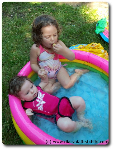 We’ve finally had some beautiful, long awaited weather, and it’s been all out hot – no middle ground this summer! We decided to take out the paddling pool and let the girls have a swim. (For the record, I was holding Aviya the whole time, it was just when I was taking this picture that she lay back, and her sister held her hand to keep her safe. So sweet!)