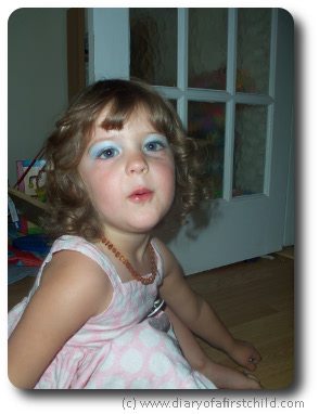 Okay, don’t judge me! I went out a few days ago and wore make-up. I know… once upon a time that was the norm. Anyway, since then, Ameli’s been saying ‘I want purple eyes, Mama, like you.’  Well, we did it, she wore it for a few hours and she’s not asked again since. But she enjoyed it.  She did walk around all afternoon going, “Look Mama, I’m Luschka” though, which was rather sweet.