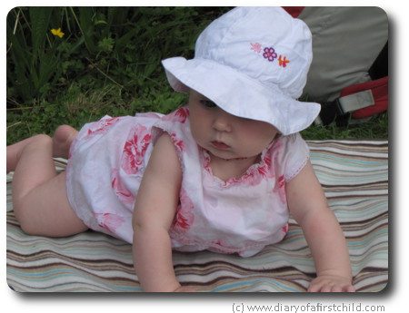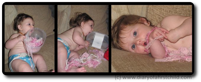 Aviya doesn’t sit up unassisted yet, which really bugs me! By this age, Ameli was crawling already! But then, I always used to say that she robbed me of a ‘babyhood’ since she did everything so fast, so I don’t know why I’m complaining now! Anyway, if she could sit up she’d have a lot more fun, but since she doesn’t, she flops over a lot. I gave her a box of ribbons to play with, and she tried to eat the box and then the ribbons, and then she flopped over, but at least she had fun for a few minutes.