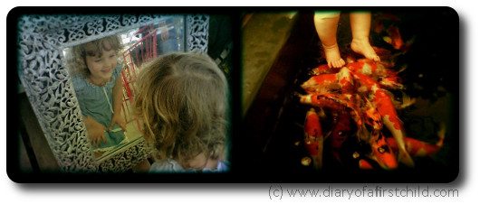 I took the girls out for a walk at our local garden centre with another friend, and just snapped pictures as we went along. Here’s Ameli looking in the mirror (what a stunning picture, right?), and the next one is Aviya getting a pedicure* from the koi fish. She wasn’t sure about it!