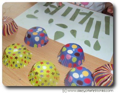 I cut the ‘stems’ and ‘leaves’ out for Ameli, and dotted them with glue. She stuck them all over the place – a few of the leaves actually made it onto stems, but others were not so lucky. Either way, its important to let her craft without trying to guide her every step, so we’ll just assume those are some autumn leaves in the sky there!