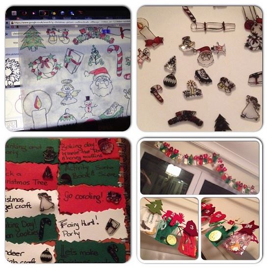 We love Shrinkles*, this plastic ‘paper’ that you can draw on, cut out and then put in the oven and it shrinks to 7 times smaller and thicker, so you can make jewellery and all sorts from it. We used them to decorate our activity cards in the activities calendar.