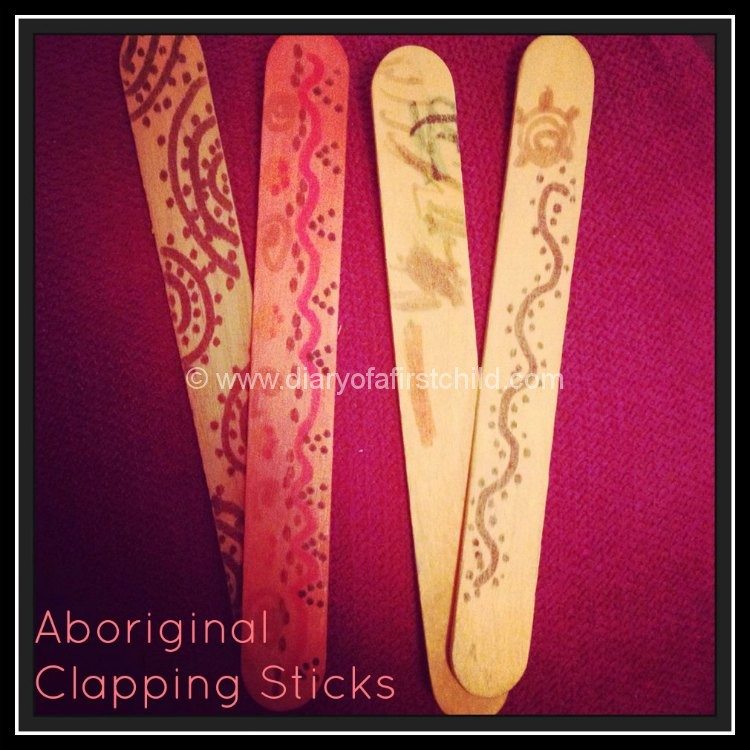 Australia Day Clapping SticksAnother fun and easy musical activity is making ‘clapping sticks’. We used lollipop sticks and decorated them. Easy peasey. (I also found this little ditty. It’s not at all Australian or aboriginal, but it’s quite sweet to get the children making music with their sticks!)  If you want to take the ‘knowledge of the world’ learning further, this Youtube video has aboriginal singing, dancing and great examples of the clapping sticks in use.