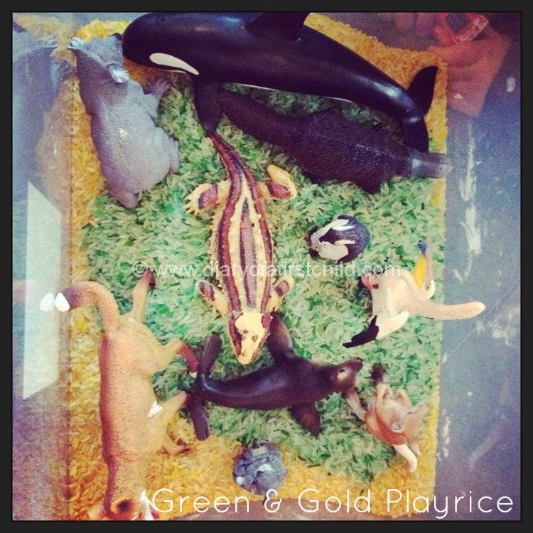 Green and ‘gold’ rice is good fun, always. In our group the almost two year old’s love it as much as the over four’s. It’s just a great sensory experience. Here are some instructions on how to make coloured rice, and we used Australian animals, but could have added cups, pourers, gardening tools, forks – anything really. It all adds extra elements to the game. To add a learning element to the fun, you can also add matching pictures for smaller children to find and make pairs.