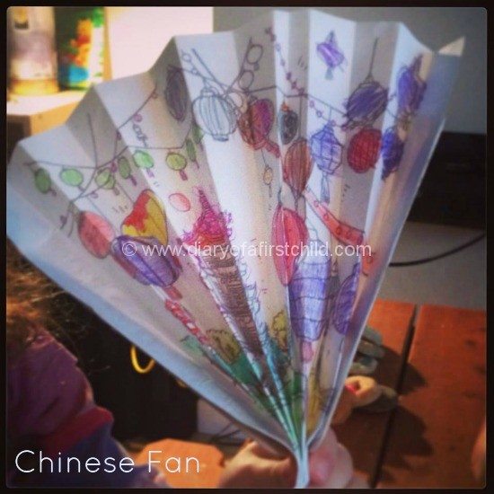 Fans are just as easy to make. First we printed off a colouring picture of a Chinese Lantern Sceneand coloured it. Next, we glued two popsicle sticks to the short ends of the A4 page, then folded the paper in a zia-zag pattern, before gluing together the bottom zig-zags, and opening the top, thereby making a fan.
