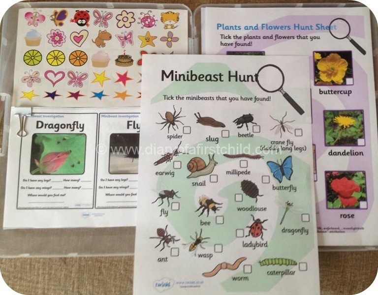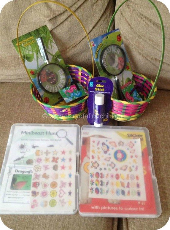 We recently went to a birthday party for a four year old. I had a very small budget, and didn’t want to buy a toy, as such so instead I bought a box file, magnifying glass, basket, stick of glue, a note pad and pen on a lanyard. Inside the box, I placed a few printed worksheets for mini beast hunting, a spring hunt checklist and so on.